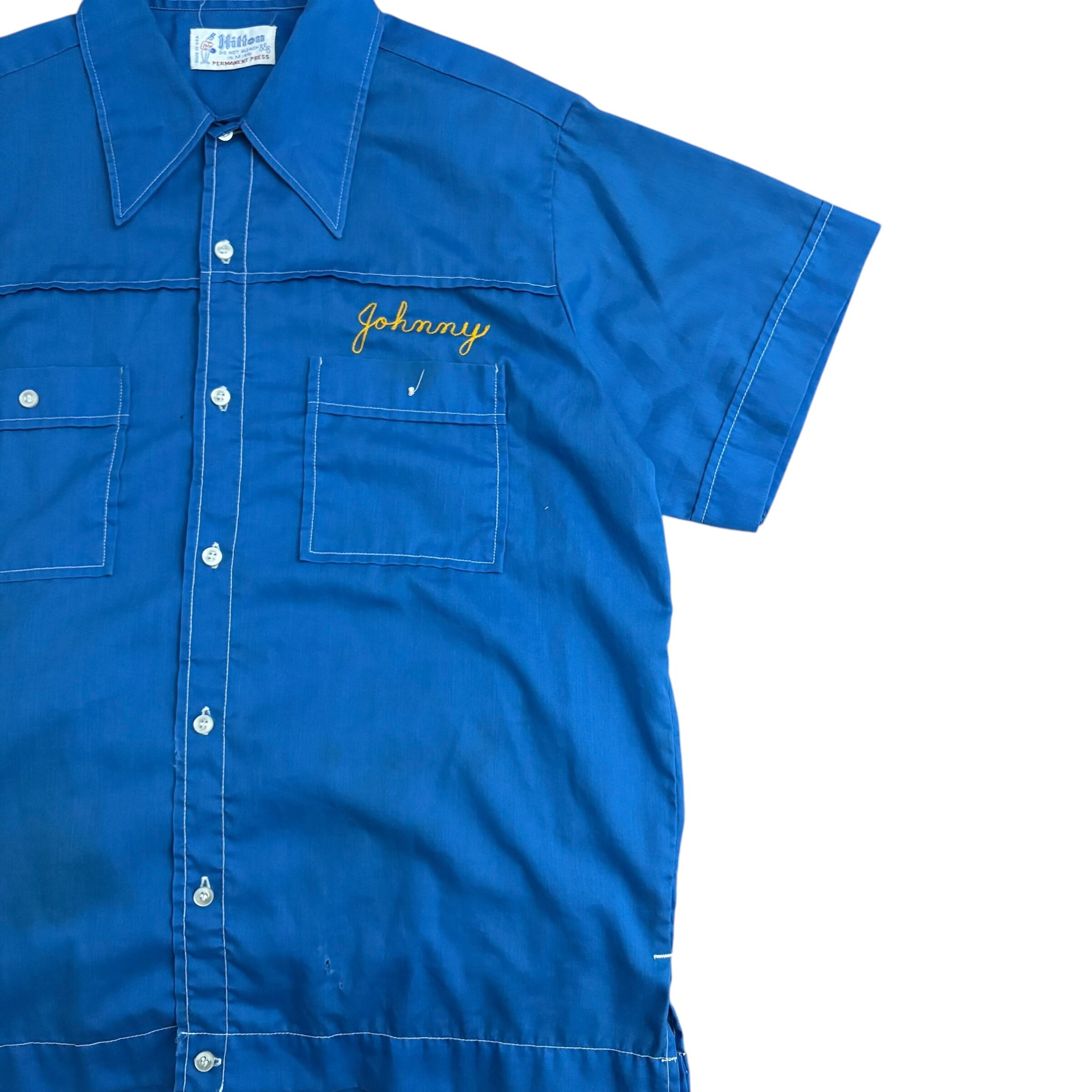 ヒルトンのボーリングシャツ!ブルーのボディーにホワイトステッチ、刺繍のデザインもシンプルながらに絶妙なデザイン!色合いが最高にかっこいい